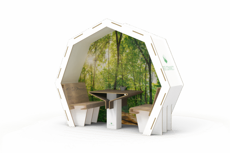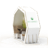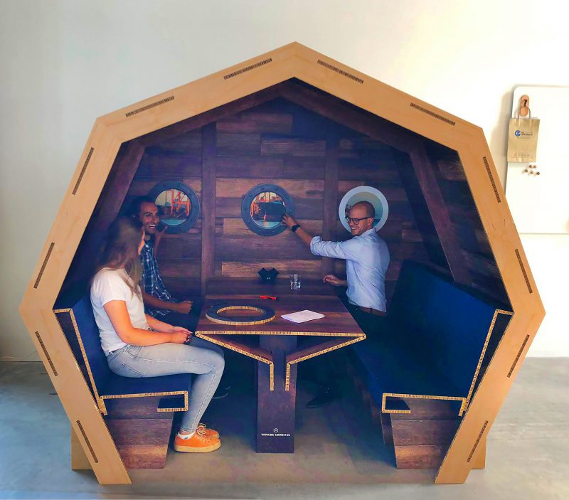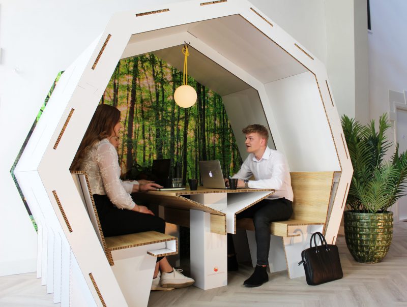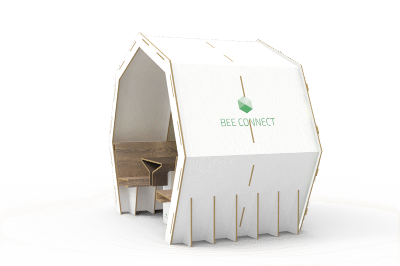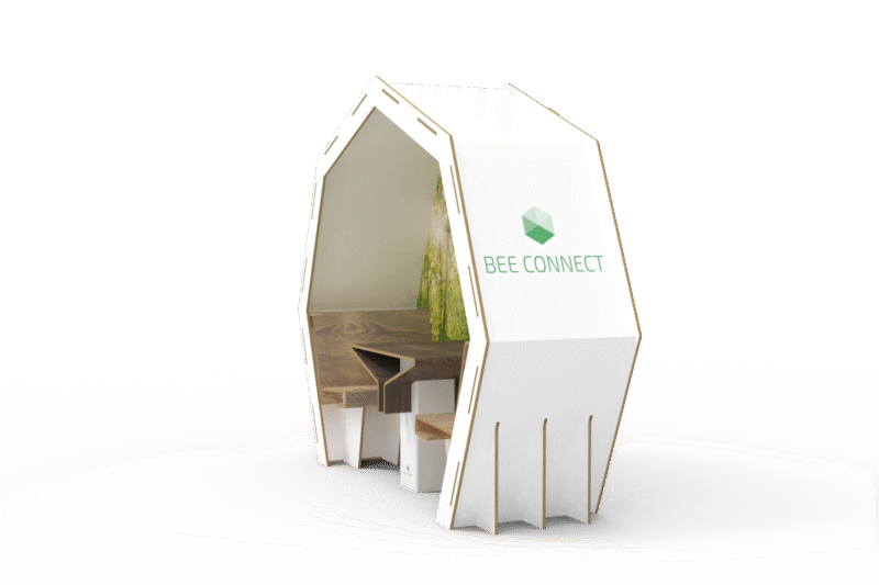 De Bee Connect P4/P2 is een pop-up vergader/werkruimte geschikt voor kantoor en beurs. Deze vergaderbox onderscheid zich op het gebied van vormgeving, materiaal en gewicht. De Bee Connect is modulair opgebouwd uit FSC gecertificeerd honingraatkarton, dat uiteindelijk weer voor 100% te recyclen is. De Bee Connect wordt lokaal in Nederland geproduceerd.