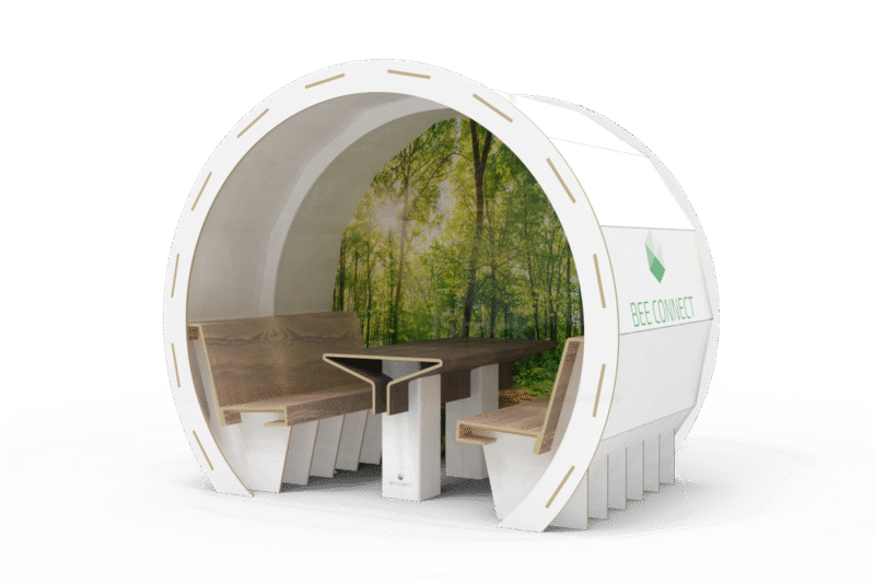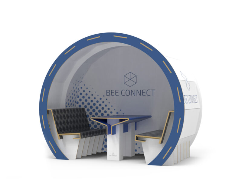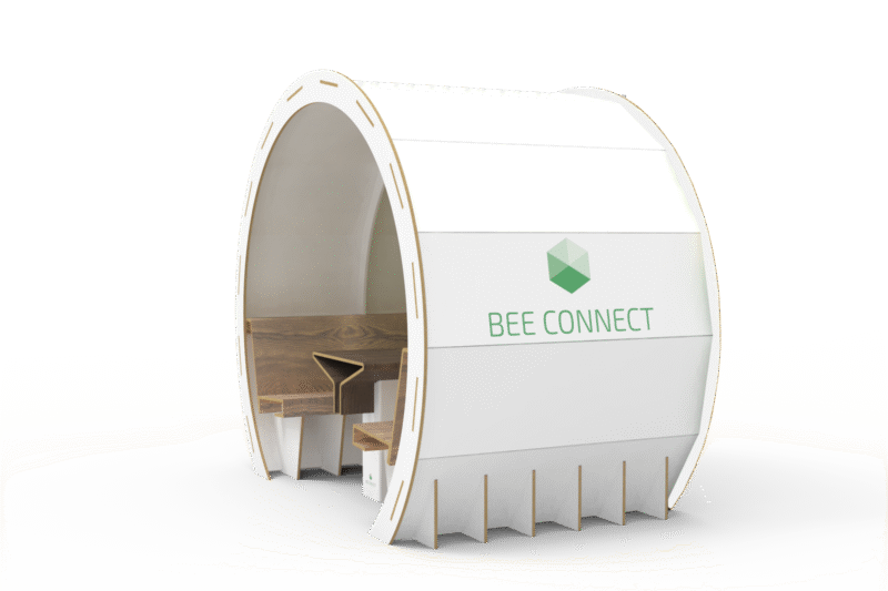 De Bee Connect P4/P2 is een pop-up vergader/werkruimte geschikt voor kantoor en beurs. Deze vergaderbox onderscheid zich op het gebied van vormgeving, materiaal en gewicht. De Bee Connect is modulair opgebouwd uit FSC gecertificeerd honingraatkarton, dat uiteindelijk weer voor 100% te recyclen is. De Bee Connect wordt lokaal in Nederland geproduceerd.