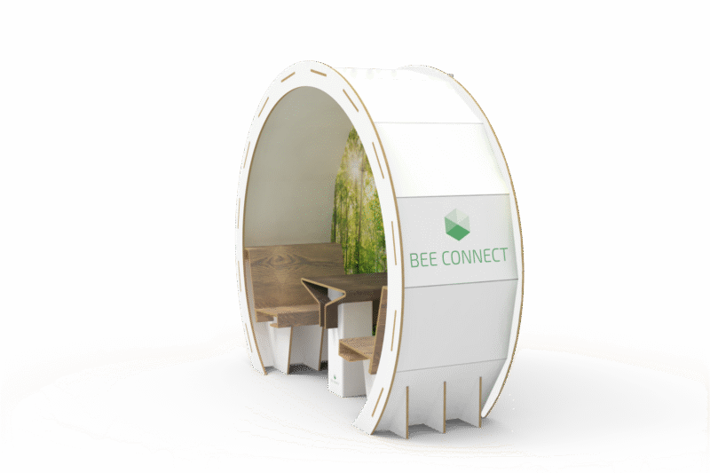 De Bee Connect P4/P2 is een modulaire pop-up vergaderruimte van 100% recyclebaar karton. Lichtgewicht, snel op te zetten en volledig te bedrukken voor maximale merkimpact. Ideaal voor kantoor, beurs of event – duurzaam, opvallend en flexibel.