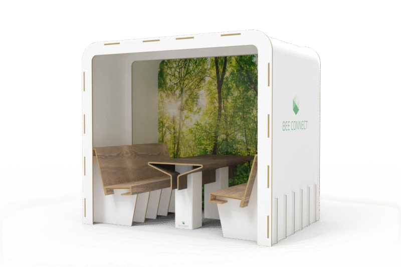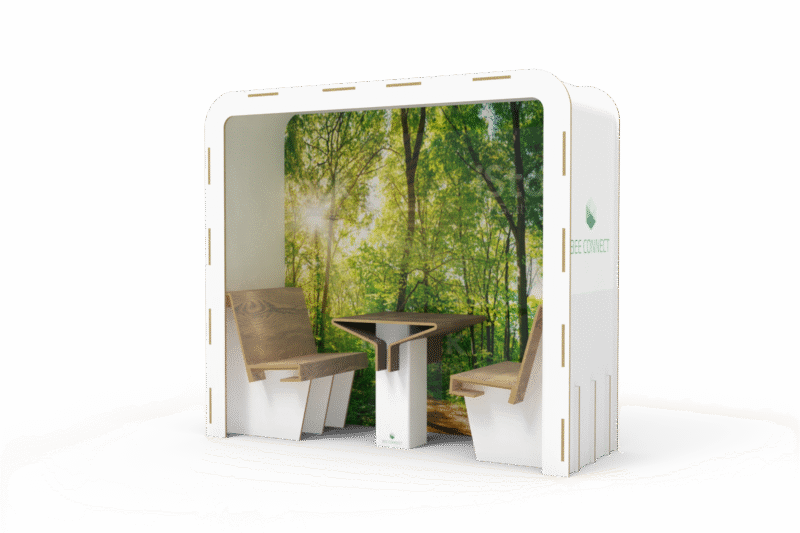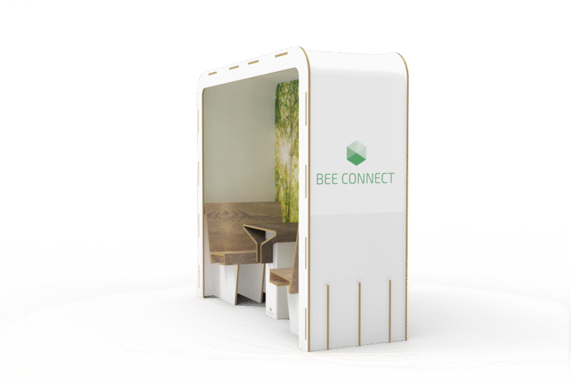 De Bee Connect P4/P2 is een pop-up vergader/werkruimte geschikt voor kantoor en beurs. Deze vergaderbox onderscheid zich op het gebied van vormgeving, materiaal en gewicht. De Bee Connect is modulair opgebouwd uit FSC gecertificeerd honingraatkarton, dat uiteindelijk weer voor 100% te recyclen is. De Bee Connect wordt lokaal in Nederland geproduceerd.